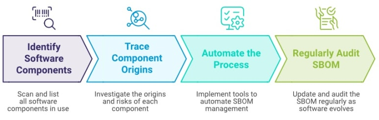 이와 같은 단계를 따르면 SBOM을 통해 보안과 컴플라이언스를 유지하고, 지적 재산권을 보호하며, 기업의 리스크를 최소화할 수 있습니다. 이 과정에서 중요한 것은 일관성 및 자동화이며, SBOM은 문서화된 소프트웨어처럼 동적으로 관리되어야 합니다.